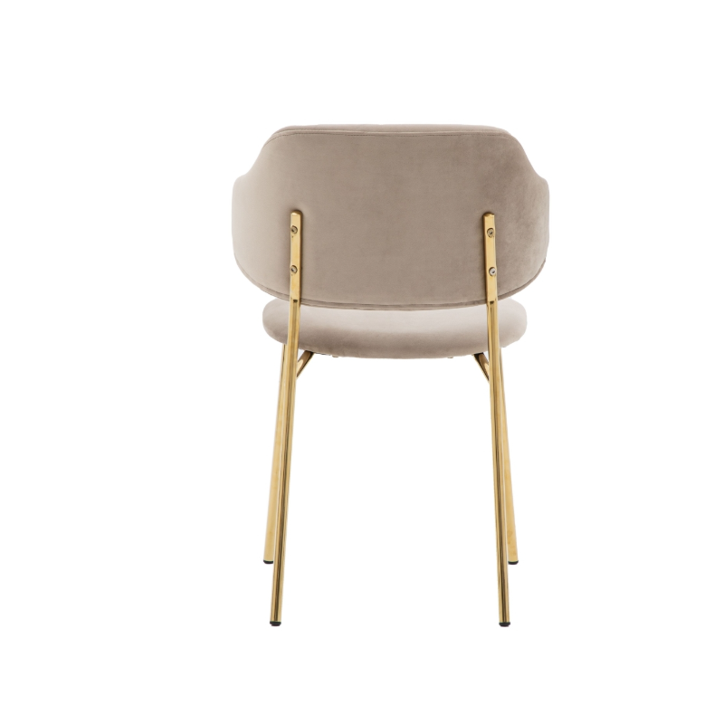 Add a little luxury to your dining space or office, these chairs offer contemporary modern design with a hint of old fashion glamour. Upholstered in soft taupe velvet and feature a unique split design and slim golden metal legs. Sold in two's priced individually.