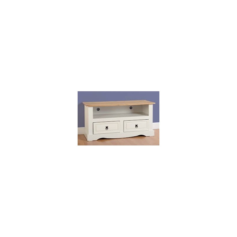 Cream painted pine TV unit suitable for low line, widescreen TVs. The contrasting distressed pine tops give a warm & neutral vibe which allow the Cortana collection lend itself to almost any interior.